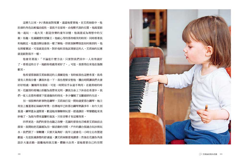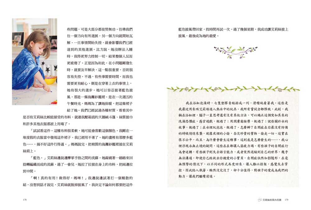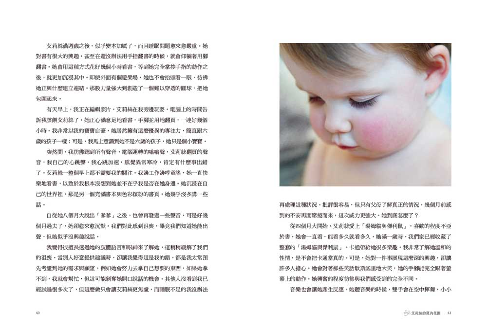 每天都和學步兒一起玩耍,是一般媽媽的日常,但這些尋常事卻常讓我們心碎。我會把艾莉絲最愛的玩具和書放進袋子裡,閉上眼睛祈禱今天出門一切順利,希望她會像其他孩子一樣玩得開心,不要躲在鋼琴後面排列蠟筆。我希望可以不用一直盯著她,即使轉開目光,再回過頭時,也會看見她在微笑。喔,我多希望事情會如此進展啊!可是,不論我多麼希望,再怎麼祈求好運,結果都不會改變。
