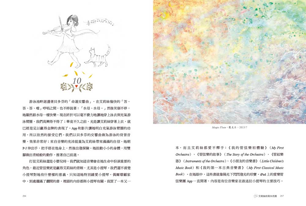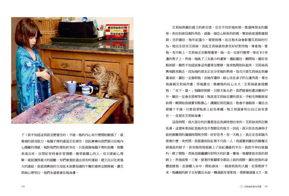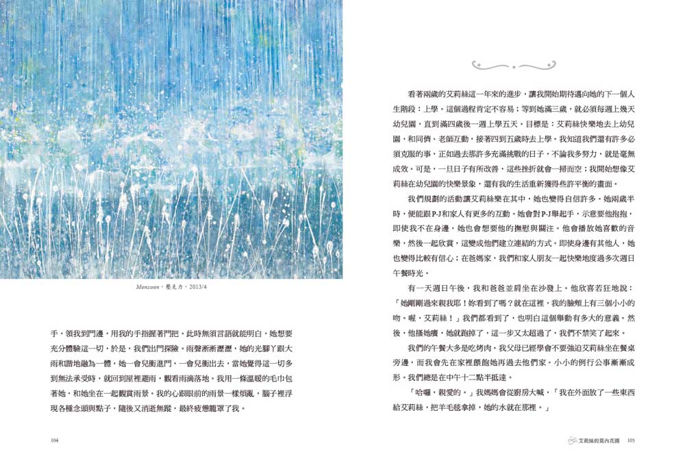 一開始,她先用手掌輕輕拍了拍紙張,然後靠近察看,鼻子都快貼到紙上了。她的動作看似親吻紙張,不過她其實是在用上脣感覺紙的質感。她的頭轉向一邊,直視著我,綻放笑容。這種少見的眼神接觸是她的一大改變。我把她最愛的畫筆遞過去,她高舉畫筆,懸空迅速輕彈幾下,色彩在紙上很快爆開來,棉布水彩畫紙巧妙地吸收了水彩顏料。等顏料乾了之後,她又上一層白色,只是這次不加水調色。她用一支比較長的畫筆,以波浪般的筆觸,在紙上畫出重複的圖案;然後,她繞到桌子的另一頭,輕點筆刷,創造出白色的小點。我把她的繪畫桌推到廚房,讓畫晾乾,然後開始拖地。這次繪畫過程特別激烈,顏料潑濺得到處都是。此時,我聽到開門聲,P-J 從倫敦回來了,艾莉絲在廚房等著他進來,對他笑逐顏開,抓著他的手到桌子旁邊。