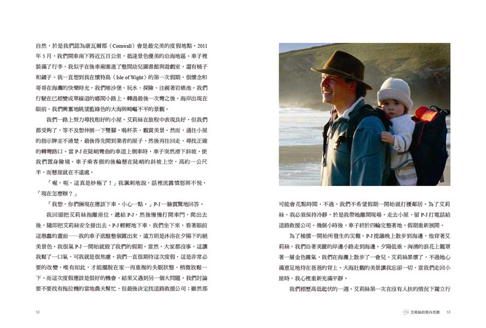 我受不了其他父母的表情,一開始是同情的目光,然後是不高興我們干擾了整個團體。那種感覺就像我們因為某個原因遭到放逐,而我甚至不明白問題出在哪裡,我只知道的是我們格格不入。就連待在公園都很困難。其他小孩快樂地溜滑梯,在媽媽的推動下盪鞦韆,在沙坑玩耍,或在旋轉盤上轉圈圈,艾莉絲卻在檢視遊戲器材上的螺絲帽和螺絲釘。她沒興趣玩這些遊樂設備,她追求的是知識,渴望了解這些設備是怎麼運作的。我們每次去公園,就會重複同樣的流程:她按照同樣順序,向我指出她下一個目的地,一一走到設備旁,有系統地繞完公園一圈。