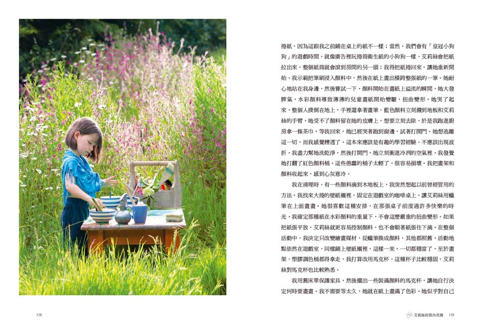 在大部分活動中,艾莉絲最後總會推開我。但畫畫不一樣,她希望我在廚房陪她。我變成不可或缺的一部分,負責幫她調出想要的顏色,於是我把握機會使用更多詞彙,而她的回應好到我心裡開始盤算,該如何利用她這個最新的興趣呢?我決定犧牲一下,不再保持廚房井然有序了。廚房一直是屬於我的空間,也是大人的區域,至今還沒有變成幼兒活動的場地。每天早上,我們在這裡安靜地坐著,準備食物,聊些大人的話題,我們甚至很少在廚房招待朋友。可是這件事太重要了,這張繪畫桌會永遠擺在這裡,不論何時,她都可以隨時使用。這會是她隨心所欲的空間。