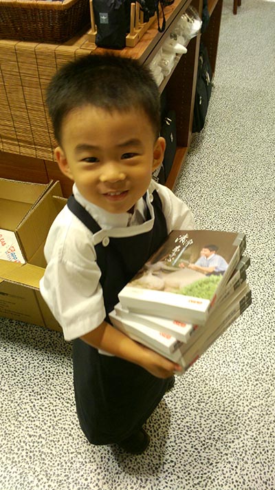 | 才四歲半的劉惜寬,已經非常嫻熟書軒的補貨作業, 更熟悉產品特性,會觀察客人屬性,推薦合適產品。 |