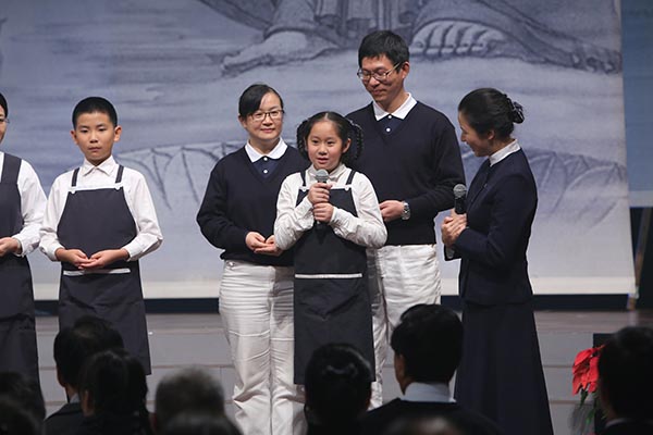 | 在書軒服務的一大重點,就是要能有禮貌、直視對方眼睛向客人問候。 小志工陳芃均著麥克風在數百觀眾前分享自己學習手語歌的心得,落落大方。 |