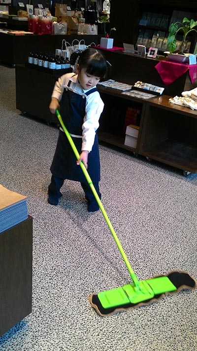 | 在家裡不見得有機會做家事的小志工,在書軒要學習如何洗抹布、擰抹布、摺抹布, 細心擦拭桌面、書籍、貨品,小志工Sophie在這些過程裡,培養了耐心和做事的用心。 |