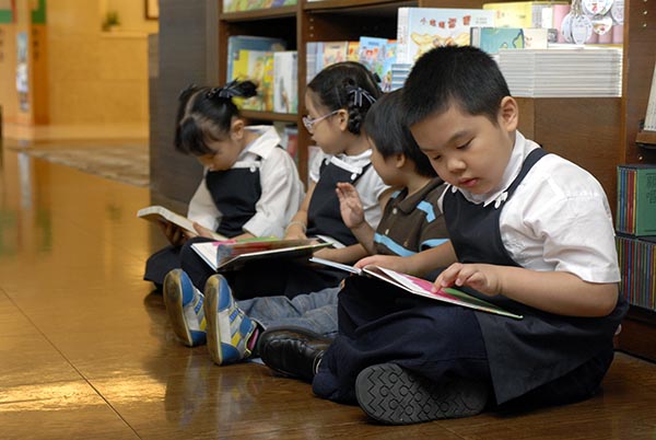 | 「人文薰陶」是培訓小志工很重要的區塊, 書軒教小朋友知書達禮、進退有度,由內而外展現的人文氣質。 謝誠軒小志工在休息時間,會和同伴安靜的坐在地上看書,展現出應有的規矩及禮儀。 |